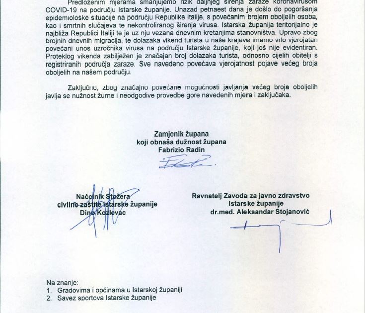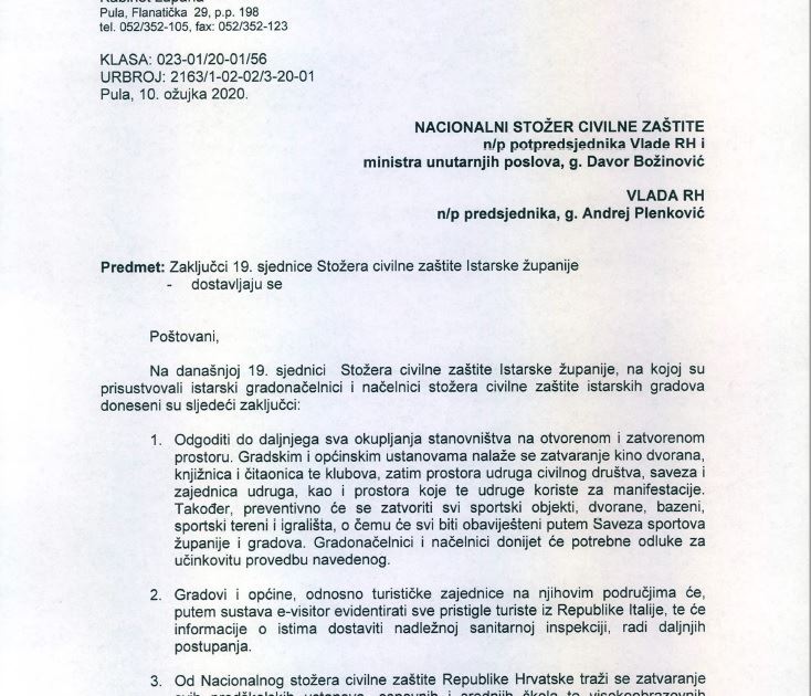 Na današnjoj (10.03.2020.) 19. sjednici Stožera civilne zaštite Istarske županije, na kojoj su prisustvovali istarski gradonačelnici i načelnici stožera civilne zaštite istarskih gradova doneseni su zaključci u privitku.