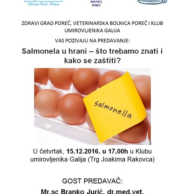 Zdravi grad Poreč i Veterinarska bolnica Poreč, u suradnji s Klubom umirovljenika Galija, u četvrtak, 15. prosinca 2016., u 17 sati u Klubu umirovljenika Galija organiziraju predavanje s vrlo aktualnom temom Salmonela u hrani – što trebamo znati i kako se zaštititi?