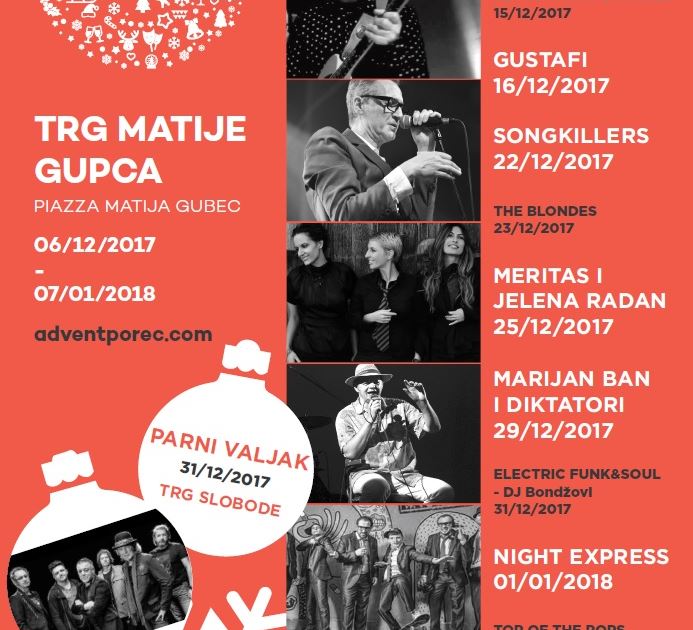 - Na adventskom paviljonu na Trgu Matije Gupce imat ćemo priliku slušati Vatru, Gustafe, Songkillerse, Meritas i Jelenu Radan, Marijana Bana i Diktatore, Night Express, Cirkus, i još mnoge druge. Svi koncerti počinju u 20 sati. Osim koncerata, pozivamo vas i na nezaobilazne programe za djecu. - petkom i subotom u 18 sati na lokaciji porečkog Adventa izmjenjivat će se Adventski cirkus i predstave u režiji Istra Inspirita i udruge Birikina, koje će svojim bogatim kostimima i zanimljivim pričama sigurno oduševiti naše najmlađe, rekla je Ilečić Arklinić i dodala kako, osim web i Facebook stranice, upravo s današnjim danom kreće i promotivna kampanja koja će i na lokalnom i na nacionalnom nivou, kao i na stranim tržištima privlačiti goste u Poreč kako bi posjetili bogat program našeg Adventa.