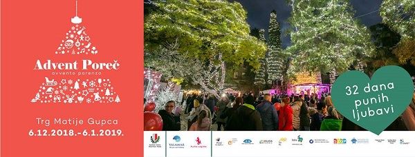 Advent Poreč održavat će se na Trgu Matije Gupca od 6. prosinca 2018. do 6. siječnja 2019. godine, dok će porečko besplatno klizalište ostati otvoreno do 13. siječnja.