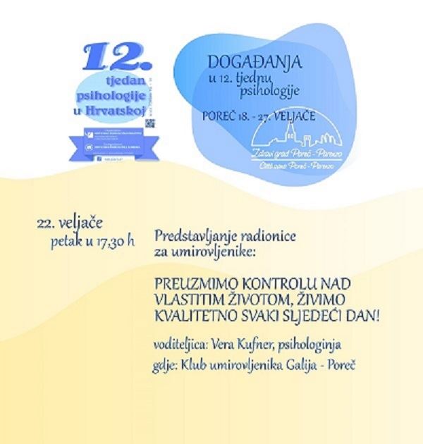 Predavanje-prezentacija: Preuzmimo kontrolu nad vlastitim životom i živimo sretno i kvalitetno svaki sljedeći dan psihologinje Vere Kufner održat će se u Klubu umirovljenika Galija u petak 22. veljače u 17,30 koje organizira Zdravi grad Poreč - Parenzo u obilježavanju 12. tjedna psihologije.