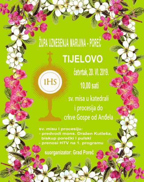 Središnja svečana misa za blagdan Tijelova u Poreču 20.06.2019. održat će se u Eufrazijevoj bazilici s početkom u 10 sati, nakon čega slijedi procesija od bazilike duž ulice Decumanus do crkve Gospe od anđela na Trgu slobode. Cijeli će događaj u gotovo dvosatnom prijenosu uživo emitirati i HRT na Prvom programu, najavili su na današnjoj konferenciji za novinare u Maloj vijećnici gradonačelnik Grada Poreča –Parenzo Loris Peršurić, zamjenica predsjednika Gradskog vijeća i koordinatorica programa Gordana Šušljik, te porečki župnik Milan Zgrablić.