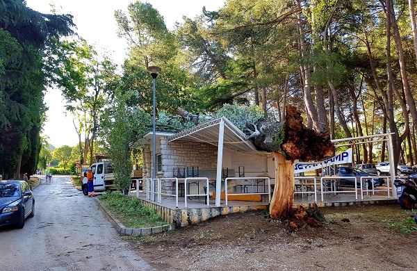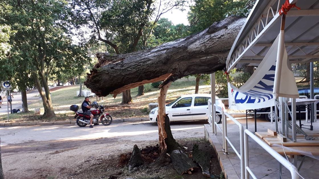 Sa uklanjanjem stabala nastavili su djelatnici gradskog komunalnog poduzeća Usluga Poreč koji su od radnog jutra na terenu. Šteta je učinjena na gradskom groblju gdje je jedna velika grana čempresa pala i oštetila nekoliko grobova. U olujnom je naletu palo je stablo i na nadstrešnicu boćališta na Gradskom kupalištu, uz lokaciju gdje se održava Ljetni kamp i streha je polomljena. Djelatnici Usluge uklanjaju polomljeno stablo, štetu na nadstrešnici treba utvrditi, a aktivnosti Ljetnog kampa će se drugačije organizirati i premjestiti na susjednu lokaciju na Gradskom kupalištu.