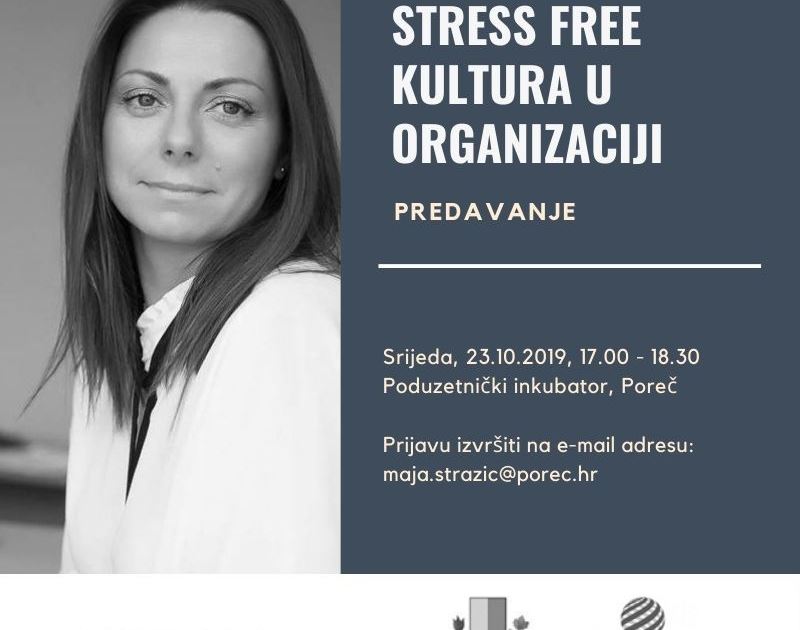 U okviru programa manifestacije Mjesec poduzetništva u Poreču, u srijedu, 23. listopada, u Poduzetničkom inkubatoru u Žbandaju, s početkom u 17,00 sati, održat će se edukacija „Stress free“ kultura u organizaciji koju će voditi Sandra Mraović Deković iz Lift Up edukacisjkog centra. Edukacija je besplatna, a mjesta ograničena zbog čega je potrebno izvršiti prijavu na e-mail adresu: maja.strazic@porec.hr s naznakom „Stress free“ kultura u organizaciji najkasnije do srijede 23. listopada do 10h.