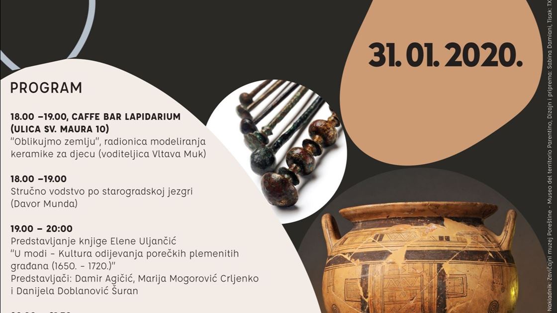 Porečka Noć muzeja započinje u 18 sati radionicom modeliranja keramike za djecu Oblikujmo zemlju pod vodstvom Vltave Muk te večernjim obilaskom starogradske jezgre uz stručno vodstvo Davora Munde. Program se nastavlja u 19 sati predstavljanjem knjige Elene Uljančić U modi - Kultura odijevanja porečkih plemenitih građana. U 20.00 sati slijedi razgovor s kazivačima na temu “Arhitektura i urbanizam Poreča danas”. U 21.30 sati na rasporedu je predavanje Davora Munde “Porečka prapovijest i Muzej”. U 22.00 sati održat će se dramska predstava Spiriti e briganti u izvedbi članova Društva prijatelja Giostre iz Poreča, a nakon toga slijedi druženje uz zakusku sve do 23 sata.Ulaz je besplatan.Više o temi Noći muzeja pročitajte ovdje .