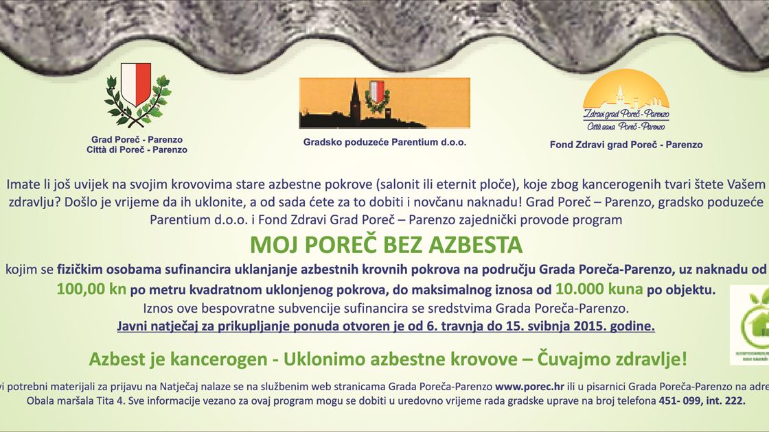 Natječaj je namijenjen svim fizičkim osobama koje žele sa svojih objekata na području Grada Poreča ukloniti azbestne krovne pokrove. Natječaj će biti otvoren od 6. travnja do 15. svibnja 2015. godine, a svim će se građanima na kućne adrese, prije početka natječaja, uz račun za odvoz otpada dostaviti i informativni letak koji će sadržavati sve informacije vezane uz sam natječaj, kao i smjernice za nabavku informativnih materijala.