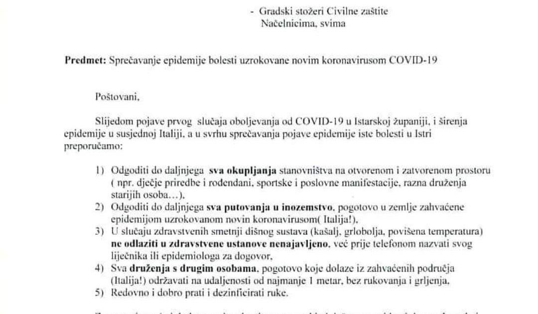 Slijedom pojave prvog slučaja oboljevanja od COVID-19 u Istarskoj Županiji i širenja epidemije u susjednoj Italiji, a u svrhu sprječavanja pojave epidemije iste bolesti u Istri, Služba za epidemiologiju Zavoda za javno zdravstvo Istarske županije preporuča: