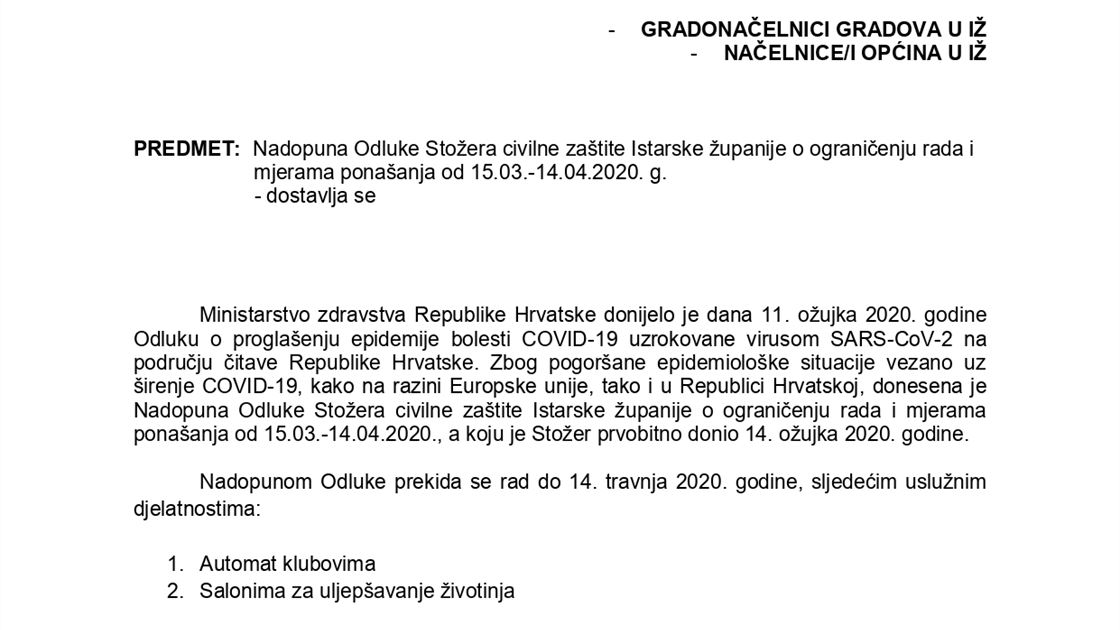 Nadopuna Odluke Stožera civilne zaštite Istarske županije o ograničenju rada i mjerama ponašanja od 15.03.-14.04.2020.