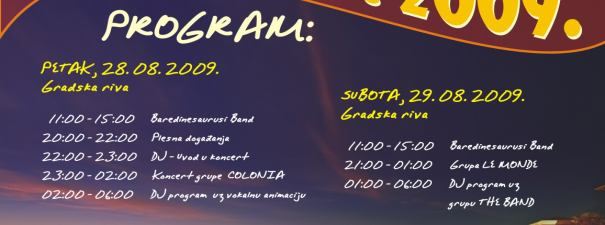 Uz bogatu gastronomsku ponudu i glazbu koja će se, bez prestanka, širiti gradom svim je posjetiteljima grada zabava osigurana I u subotu, 29.08.2009. na poznatom mjestu, gradskoj rivi, uz sljedeći program: