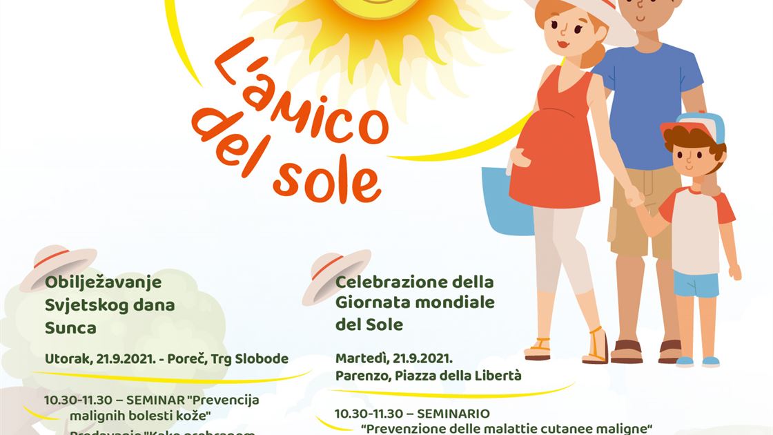 U utorak, 21.09.2021. na Trgu slobode u Poreču, s početkom u 10.30 sati održat će se obilježavanje Svjetskog dana Sunca. Svi građani i građanke pozvani su da se pridruže ovom obilježavanju, a u sklopu programa održat će se seminar o prevenciji malignih bolesti kože koji će održati liječnik specijalist dermatologije, predavanje o prehrani i pripremi kože za sunce o kojem će govoriti magistar nutricionizma, a održat će se i besplatne konzultacije s dermatologom. Za djecu bit će organizirano likovno natjecanje koje će voditi će dva likovna terapeuta, a aktivnost je zamišljena kao edukativno-kreativna radionica za djecu na kojoj će mališani naučiti kako štiti kožu od sunca. Predviđena je i nagrada u obliku paketa zaštitnih proizvoda za sunce. Sve će glazbom začiniti porečki sastav Rezime Acoustic Trio.
