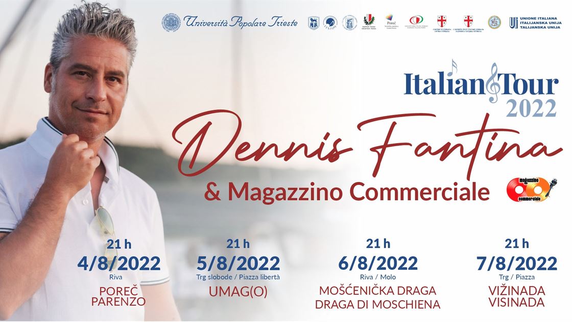 Istoga, dana, u 21 sat, na porečkoj rivi, koncert će održati Dennis Fantina, prvi pobjednik popularnog talijanskog talent showa „Amici“ Marie di Filippi iz 2001. (koji se tad zvao „Saranno Famosi“) i jedan od sudionika posljednjeg izdanja emisije „Tale e quale show“. Na koncertu, nastupa u pratnji u pratnji benda Magazzino Commerciale, koji je osnovao gitarist Stefano „Skizzo“ Marchesini, a zajedno će izvesti razne poznate hitove u rasponu od ’70-ih do danas, dotičući se različitih glazbenih stilova. Porečki je koncert prvi od etapa nekoliko etapa turneje koju će talijanski glazbenik održati na našim prostorima.