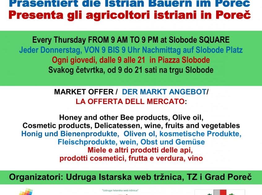 ***U slučaju lošeg vremena sajam poljoprivrednih proizvoda koji se svakog četvrtka odvija na Trgu slobode u Poreču u vremenu od 9 do 22 sata, započet će s radom nakon prestanka kiše u popodnevnim satima.