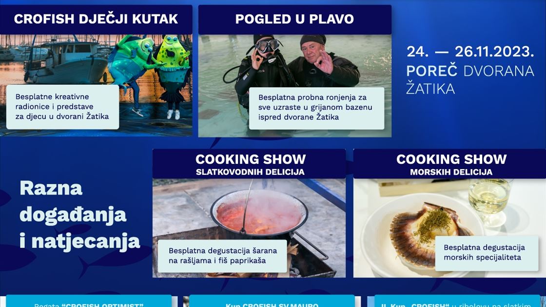 CROFISH je jedini sajam u Hrvatskoj koji se bavi područjem ribarstva. Organiziramo ga kako bismo posjetiteljima i javnostima prikazali važnost mora kao resursa, kao poveznice sa svijetom i kao načina života. Organiziramo ga kako bismo prikazali bogatu ribarsku i pomorsku tradiciju naših krajeva i važnost njegove zaštite za naš opstanak. Pozivamo Vas da nam se pridružite, razgledate štandove i izložbu fotografija, porazgovarate s izlagačima i posadama brodova, popratite natjecanja i isprobate morske i slatkovodne specijalitete vrhunskih kuhara. Sve to u Poreču, od 24. do 26.11.2023. Zahvaljujemo se gradonačelniku Grada Poreč – Parenzo na dugogodišnjoj suradnji koji je ujedno i domaćin sajma. Na pokroviteljstvu i potpori zahvaljujemo i Predsjedniku Republike Hrvatske, Vladi Republike Hrvatske, Ministarstvu poljoprivrede, Ministarstvu obrane i Ministarstvu mora, prometa i infrastrukture Republike Hrvatske, Istarskoj županiji, Hrvatskoj obrtničkoj komori, kao i suorganizatoru sajma Obrtničkoj komori Primorsko-goranske Županije, izjavio je direktor sajma Robert Momić.
