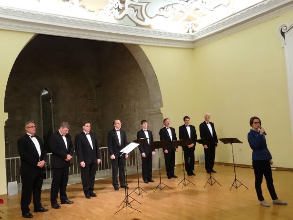 Riječ je o oktetu koji djeluje već tri desetljeća, a ubraja se među najbolje slovenske vokalne skupine, koji je gostovao i osvajao nagrade na festivalima od Azije, Europe, Sjeverne i Južne Amerike, sve do Australije. Dio svog bogatog repertoara izveli su i na koncertu održanom u Istarskoj sabornici. Sve okupljene pozdravili su zamjenica gradonačelnika Grada Poreča-Parenzo Nadia Štifanić Dobrilović, te predsjednica Oljke Miriam Pran, dok je u pauzi između izvedbi o manifestaciji govorila Jasmina Ilić, tajnica SKUD-a Istra iz Pule.
