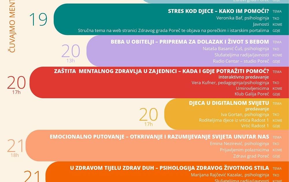Porečki program 17. Tjedana psihologije i ove godine nudi različite zanimljive aktivnosti, a Zdravi grad Poreč poziva sve zainteresirane da poprate događanja. Program u privitku.