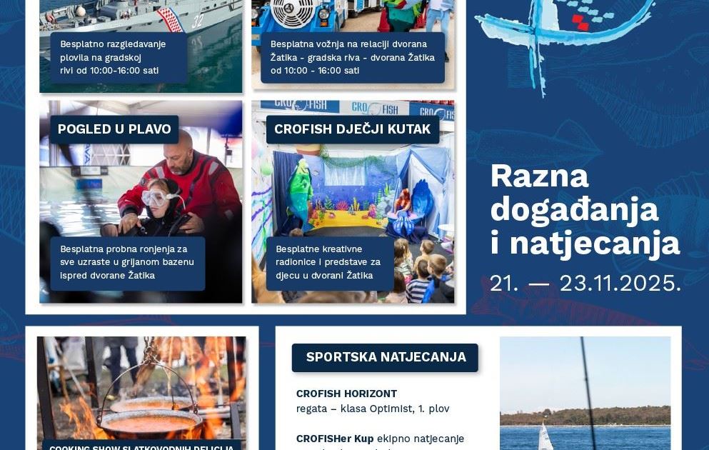 U subotu i nedjelju moći će se uživati u atraktivnim sportskim programima za sve generacije. Ljubitelje sporta očekuje čak pet sportskih natjecanja - u akvatoriju ispred Poreča održat će se CROFISH HORIZONT regata za klasu Optimist u organizaciji JK "Horizont" iz Poreča; CROFISHer Kup - ekipno natjecanje u podvodnom ribolovu u organizaciji SRK "Erik Radin" iz Novigrada; CROFISH SUP (Stand Up Paddle) regata, u organizaciji Sportske zajednice Grada Poreča; te Kup CROFISH- Sv. Mauro u udičarenju iz barke u organizaciji ŠRD „Zubatac“ iz Poreča. Osim navedenog, na barama Cerovlje ŠRD „Pazinčica“ iz Pazina organizira IV CROfish kup, natjecanja u lovu grabežljivaca živim mamcima i u lovu grabežljivaca varalicama.