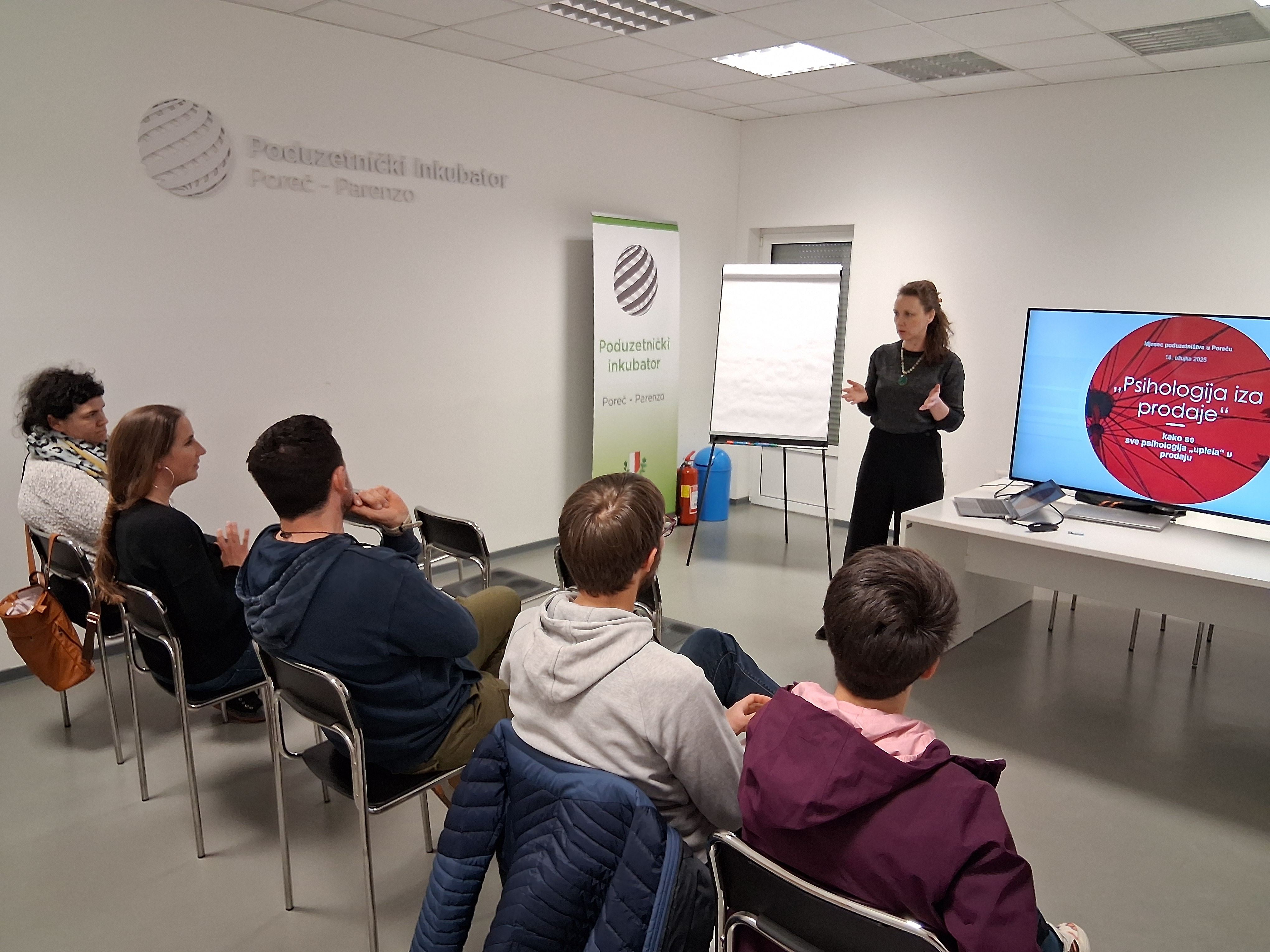 U okviru programa manifestacije Mjesec poduzetništva u Poreču, u Poduzetničkom inkubatoru u Žbandaju održano je interaktivno predavanje na temu „Psihologija iza prodaje – kako se sve psihologija „uplela“ u prodaju“.