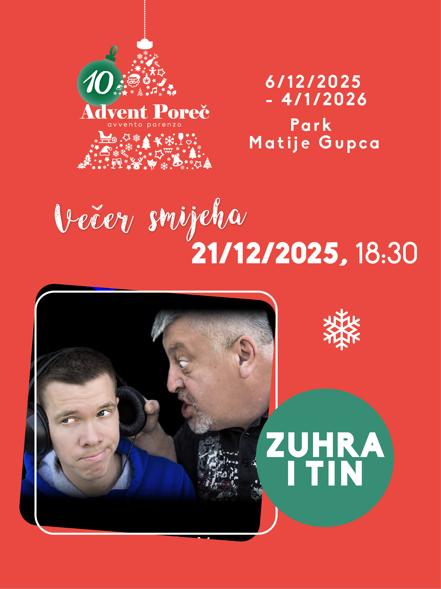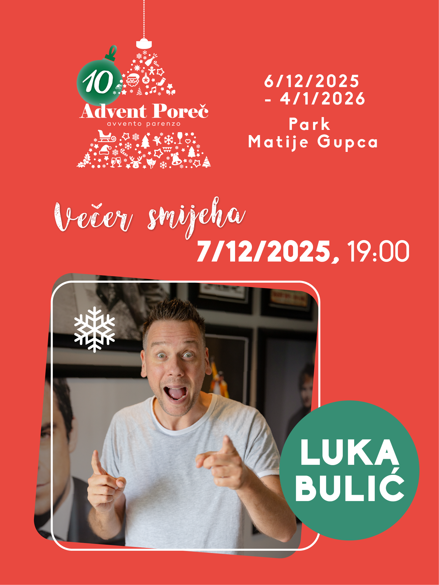 Organizatori su stoga odlučili ove godine u Poreč dovesti najpoznatija imena hrvatske komičarske scene. Prvi će na pozornicu stati Luka Bulić, koji nastupa 7. prosinca u 19 sati i najavljuje večer ispunjenu svojim prepoznatljivim humorom i energijom. Sljedeće nedjelje, 14. prosinca u 18.30, publiku će nasmijati jedan od najistaknutijih domaćih stand-up komičara, Vlatko Štampar. Seriju adventskih komičarskih večeri zatvara 21. prosinca u 19 sati omiljeni dvojac Zuhra i Tin, čiji će nastup, prema očekivanjima organizatora, privući široku publiku svih uzrasta.