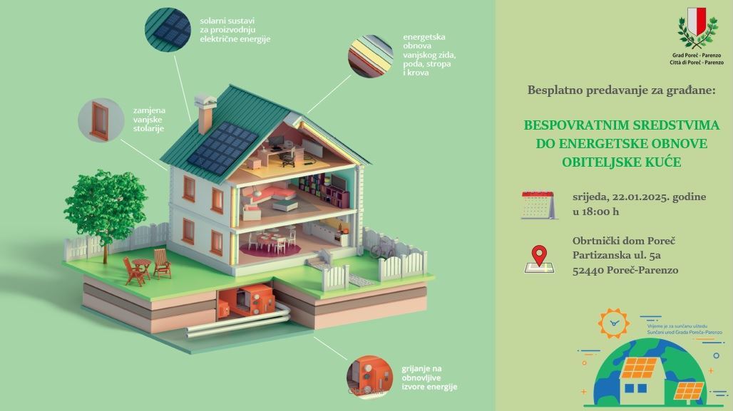 Grad Poreč-Parenzo i Sunčani ured Grada Poreča-Parenzo, pozivaju sve zainteresirane građane na besplatno informativno predavanje na temu: ''Bespovratnim sredstvima do energetske obnove obiteljske kuće''.