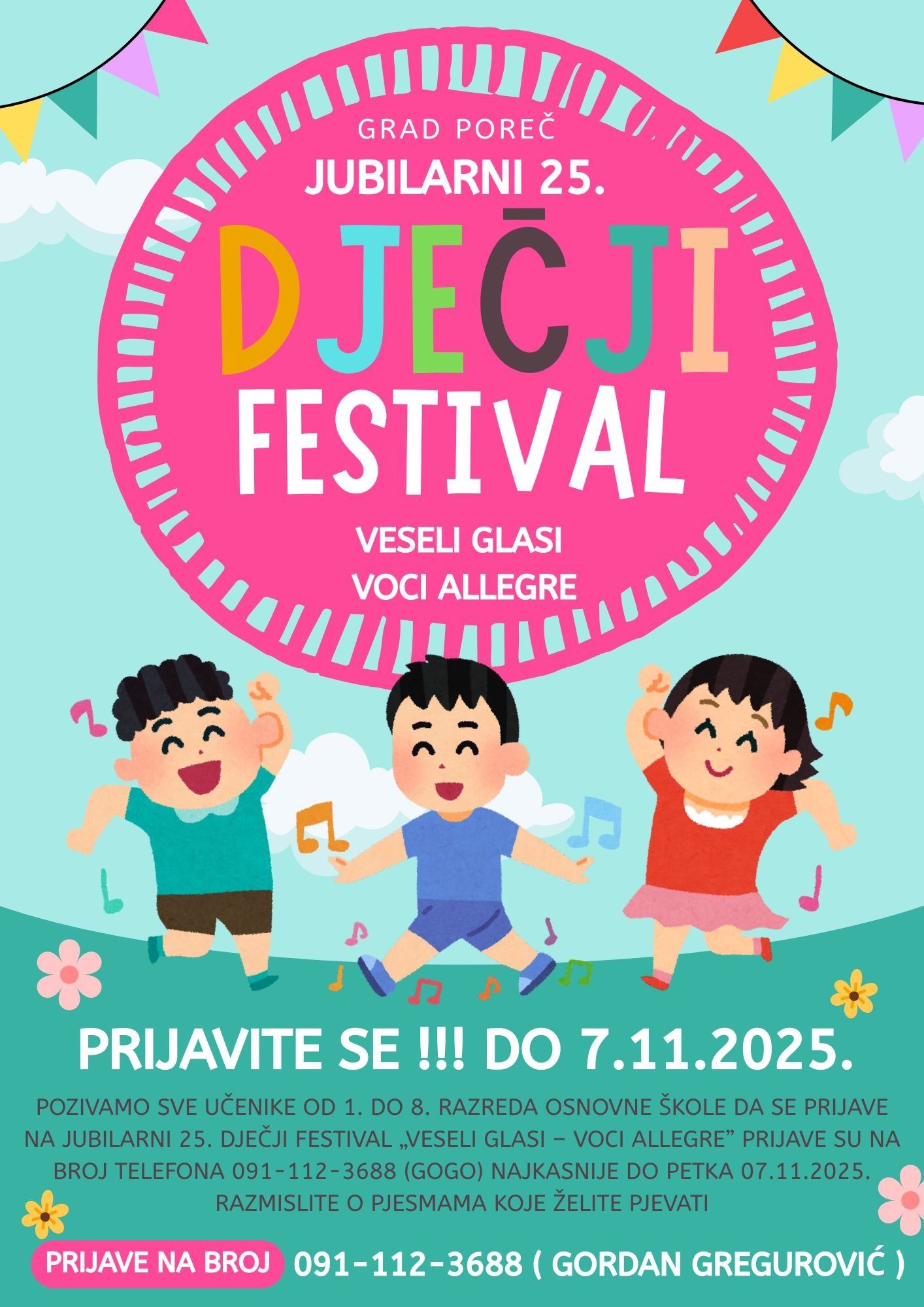 Pozivamo sve učenike od 1. do 8. razreda osnovnih škola s područja Poreča da se prijave na jubilarni 25. Dječji festival „Veseli glasi – Voci Allegre”, koji već četvrt stoljeća okuplja male pjevače i ljubitelje glazbe!