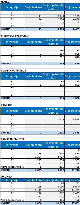 Najzastupljeniji tip smještaja je hotelski smještaj, u kojem je u 2016. godini ostvareno 1.871.872 noćenja, što je 50.027 noćenja više u odnosu na 2015. godinu. U privatnom smještaju u 2016. godini ostvareno je 792.251 noćenja, što je 34.030 manje noćenja u odnosu na 2015. godinu. U kampovima je u 2016. godini ostvareno 315.564 noćenja, što je 10.746 noćenja više u donosu na 2015. godinu.