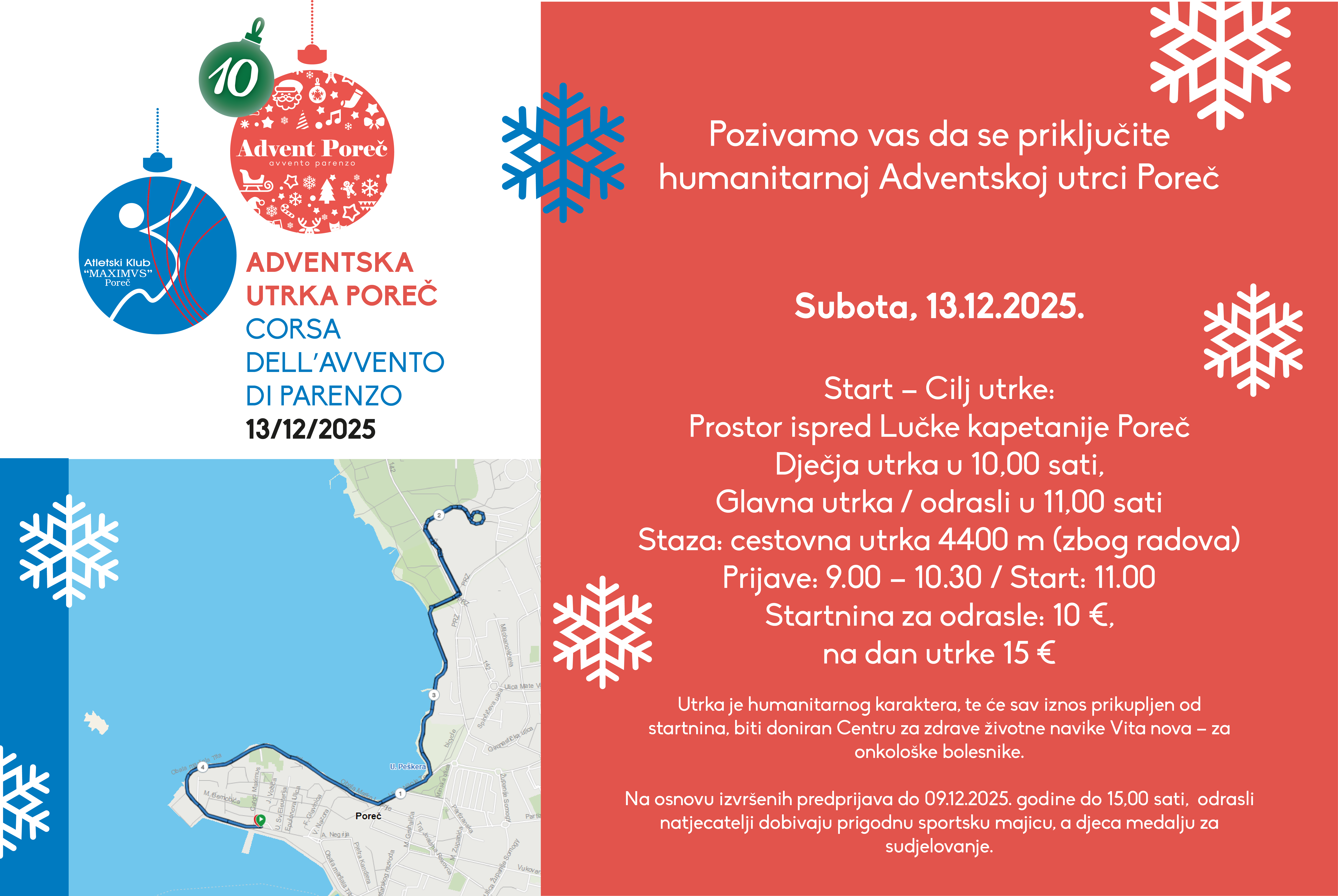 Grad Poreč – Parenzo i Atletski klub Maximvs pozivaju sve građane i posjetitelje da se uključe u ovogodišnju Adventsku utrku Poreč / Corsa dell’Avvento di Parenzo, koja će se održati u subotu, 13. prosinca 2025., u starogradskoj jezgri. Ovogodišnje izdanje utrke nosi snažnu humanitarnu poruku, budući da će sav prihod od startnina biti namijenjen Centru za zdrave životne navike Vita nova – za onkološke bolesnike. Prijaviti se možete OVDJE