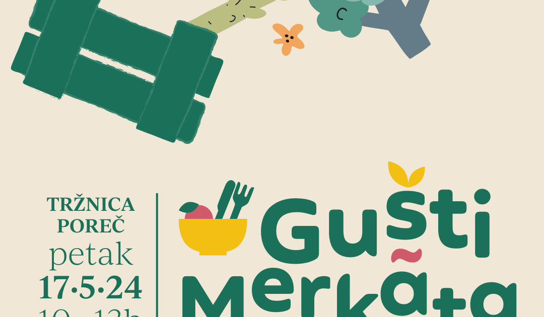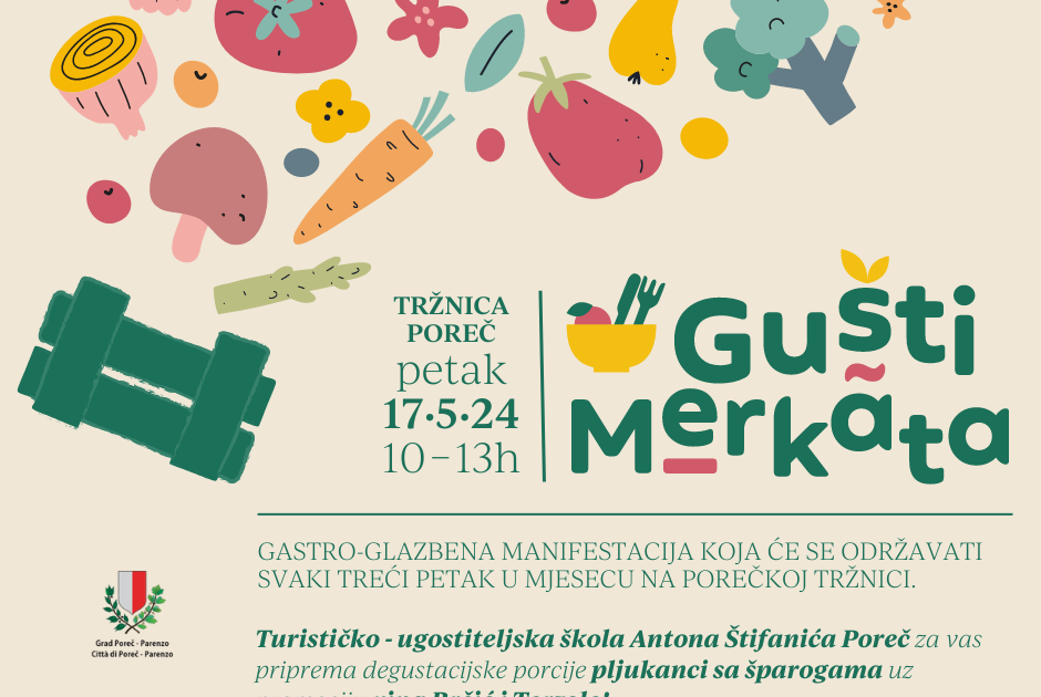 Perciò siete tutti i benvenuti al primo incontro al mercato e al nuovo evento gastro-musicale "Gušti Merkata"- "I Gusti del Mercato", che questa volta realizziamo in collaborazione con la Scuola Media Superiore Turistico alberghiera di Parenzo, dove i professori e gli allievi prepareranno piatti di degustazione. Già che siamo ancora nel periodo primaverile verranno preparati i pljukanci con gli asparagi e la promozione speciale dei vini Brčić e Terzolo.