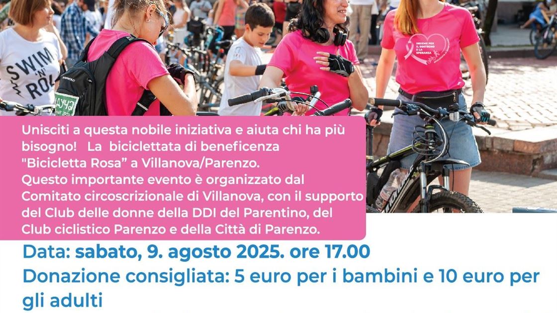 La biciclettata ricreativa e di beneficienza dal titolo “Bicicletta Rosa” si terrà sabato 9 agosto 2025, con inizio alle ore 17:00, nella località di Nova Vas (Villanova) Parenzo, nell’ambito del programma di celebrazione del santo patrono locale, San Rocco.