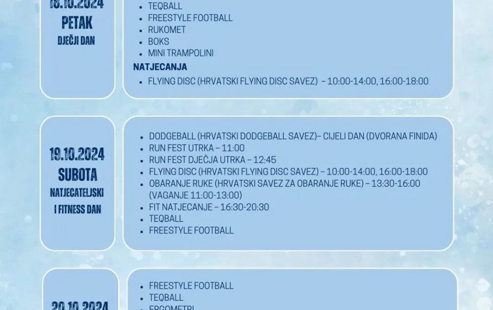 - ci sarà anche un'educazione fitness con i migliori esperti di fitness: Vanja Fijan, Milan Zarić, Teo e Aleksandra Miketa, Mirela Anić, Igor Blažinčić e Stjepan Ursa ed Eva Rusan Ursa.