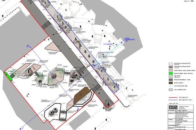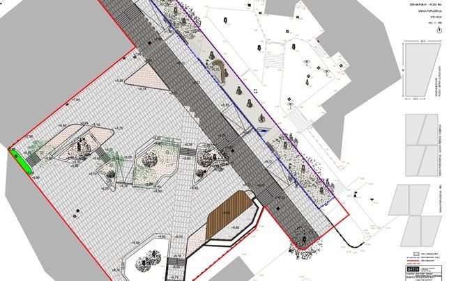 La ricostruzione manterrà la divisione iniziale dello spazio in piazza e in percorso pedonale. La piazza sarà pavimentata con nuove pavimentazioni in cemento di formato più grande, mentre le aree verdi saranno ampliate e decorate con nuove specie vegetali. Inoltre, sulla piazza verranno realizzate nuove aree verdi delimitate da muri, cordoli e panchine. Si prevede di realizzare un palco nella parte sud della piazza su due piano di diversa superficie ed altezza. Un piano sarà ricoperto da un rivestimento in legno, mentre l'altro rimarrà in cemento, e il palco consentirà lo svolgimento di vari eventi culturali e sociali. Nella parte nord-occidentale della piazza è prevista la realizzazione di nuove scale e rampe che collegheranno i due livelli della piazza.