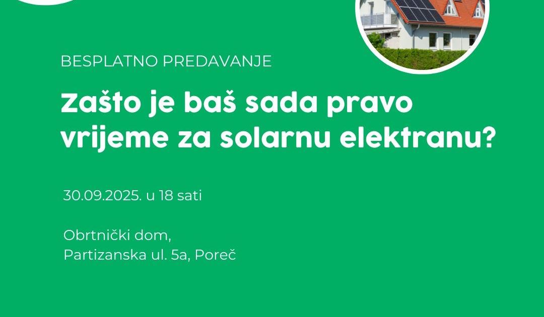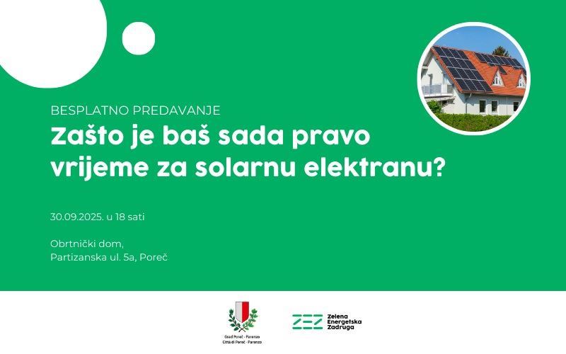 La Città di Poreč-Parenzo e il suo Ufficio Solare, in collaborazione con la Cooperativa Energia Verde (Zelena energetska zadruga – ZEZ), organizzano una conferenza informativa gratuita rivolta ai cittadini interessati all’installazione di impianti solari domestici.