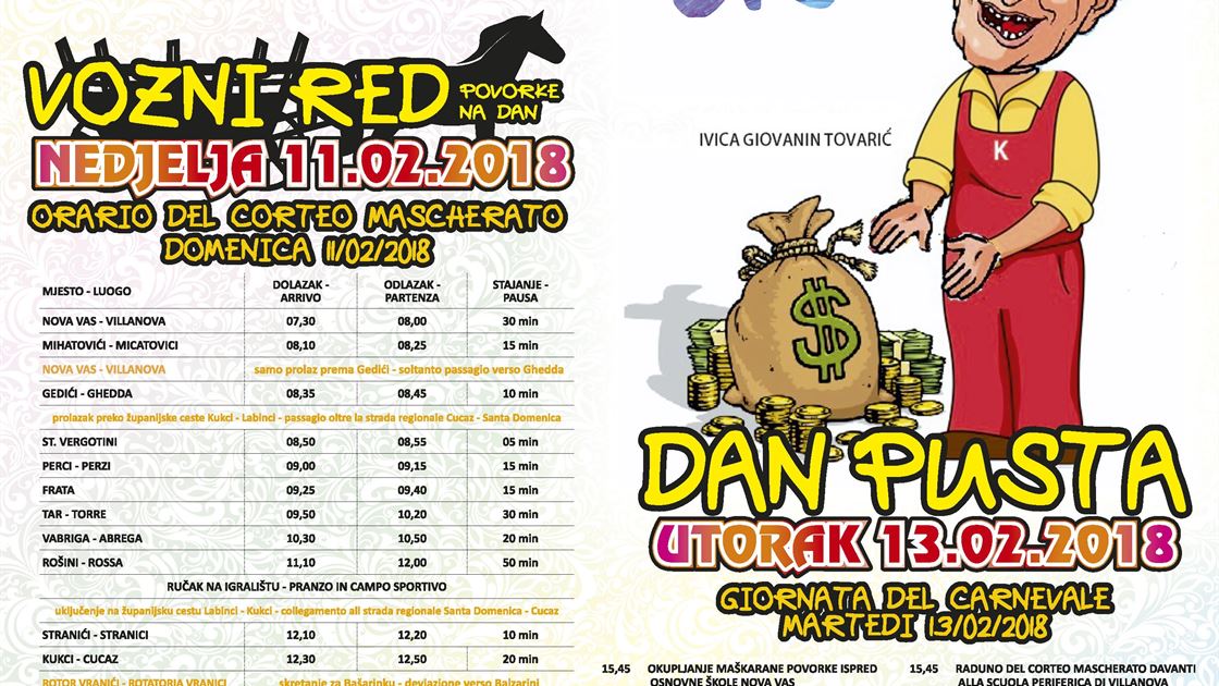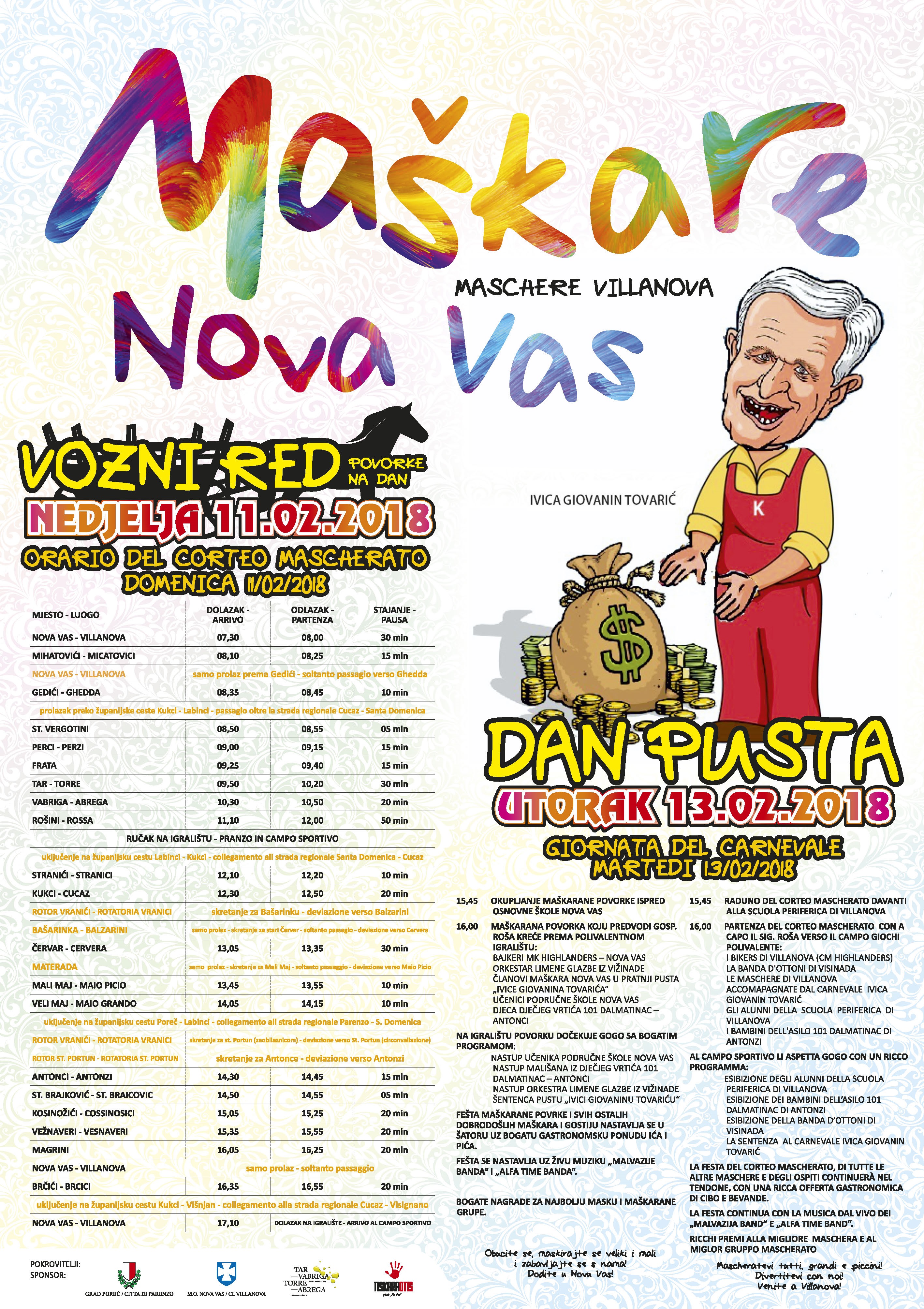 Mjesni odbor Nova Vas poziva na već tradicionalne maškare u Novu Vas, povodom kojih je pripremljen i bogat program. Fešta kreće u nedjelju, 11. veljače 2018., kada će maškarana povorka obići okolna naselja, dok je središnji događaj ovogodišnjih maškara Dan Pusta koji se održava u utorak, 13. veljače 2018.