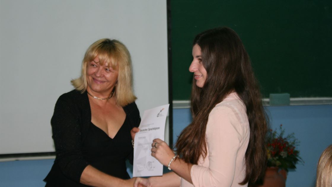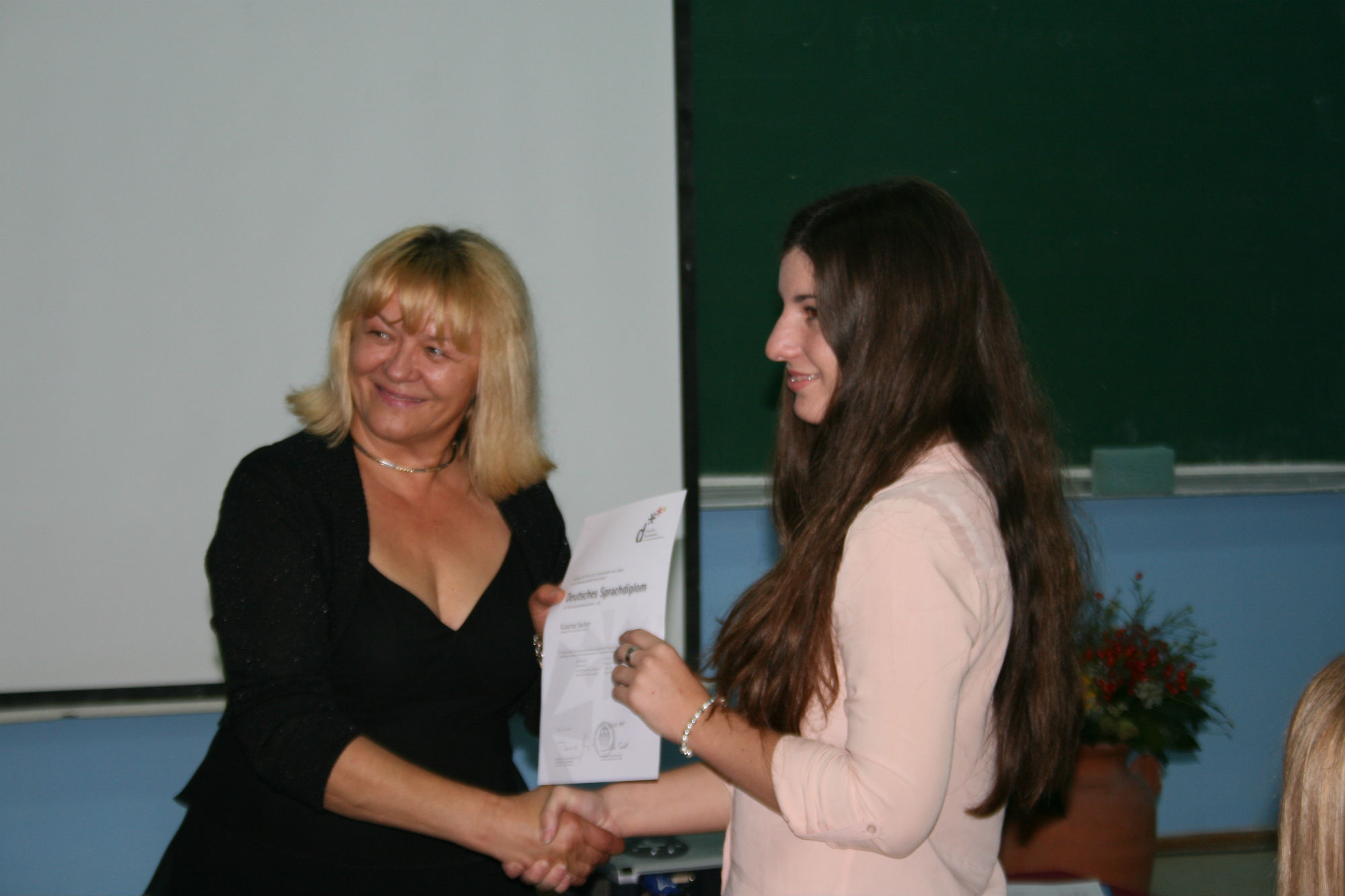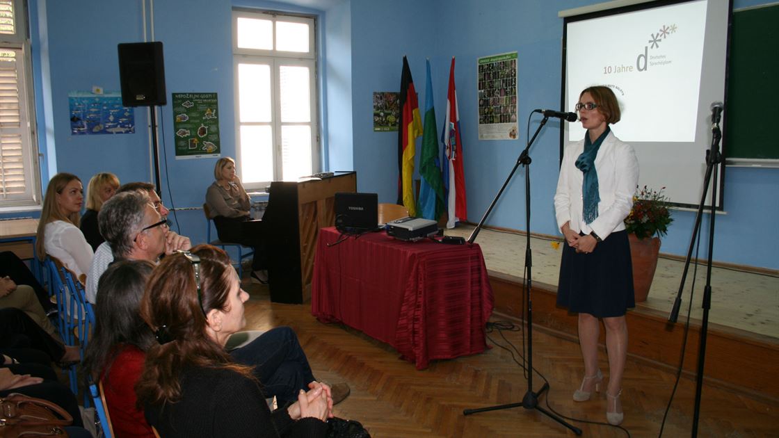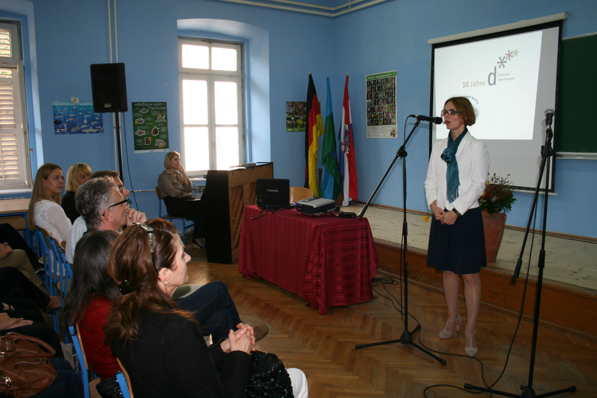 Blažević se kroz kratku prezentaciju prisjetila najvažnijih trenutaka tijekom desetljeća provođenja programa. Uz nju, u provođenju i pripremanju učenika za stjecanje Njemačke jezične diplome sudjelovale su i profesorice Suzana Roža-Brajković, Marlena Vitasović Orbanić, Deniz Brozić, Irina Ridžić, Martina Peršurić i Marina Zelenika. Zahvaljujući donacijama Bavarske vlade opremljen je multimedijalni kabinet za njemački jezik u školi, te dobivena vrijedna donacija u udžbenicima. Škola je 2007. godine dobila status ispitnog centra, a profesorice Blažević i Brozić status DSD ispitivača. Od tada do danas u školi se kontinuirano formira grupa polaznika DSD programa, a zahvaljujući značajnim uspjesima na županijskim i državnim natjecanjima njemačkog jezika, škola je dobila pravo provoditi i DSD 1 ispit za učenike koji se ističu u redovnoj nastavi njemačkog jezika.