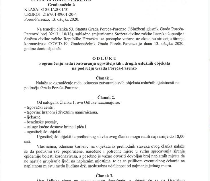 Odluka ograničenju rada i zatvaranju ugostiteljskih i drugih uslužnih objekata na području Grada Poreča-Parenzo