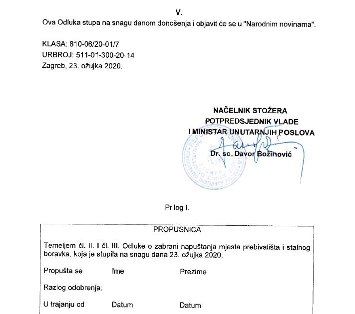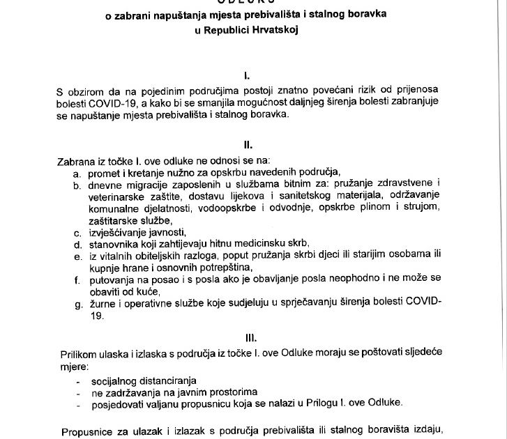 Točka III.: Prilikom ulaska i izlaska s područja prebivališta i stalnog boravka moraju se poštovati sljedeće mjere: socijalnog distanciranja ne zadržavanja na javnim prostorima posjedovati valjanu propusnicu koja se nalazi u Prilogu I. Odluke.
