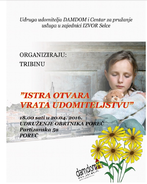 Zdravi grad Poreč i Dom obrtnika Poreč pozivaju sve zainteresirane građane da se priključe tribini, koju organizira Udruga udomitelja DAMDOM Primorsko goranske županije i Centar IZVOR Selce, a na kojoj će se moći čuti na koje se sve načine može pomoći udomiteljskim obiteljima kao i one obitelji koje podržavaju udomljavanje ili razmišljaju o udomljavanju djeteta.
