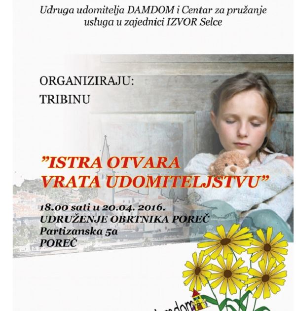 Tribina će se održati u srijedu, 20. travnja 2016., s početkom u 18,00 sati u Domu obrtnika Poreč. Udomljavanje je jedno od najhumanijih nastojanja da se kroz odrastanje pomogne djeci bez adekvatne roditeljske skrbi te pozivamo Porečane da i ovoga puta pokažu svoju humanost i podrže udrugu udomitelja i projekt Istra otvara vrata udomiteljstvu.