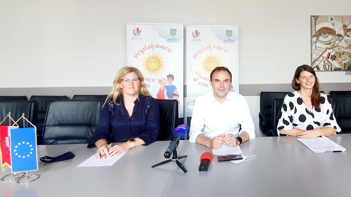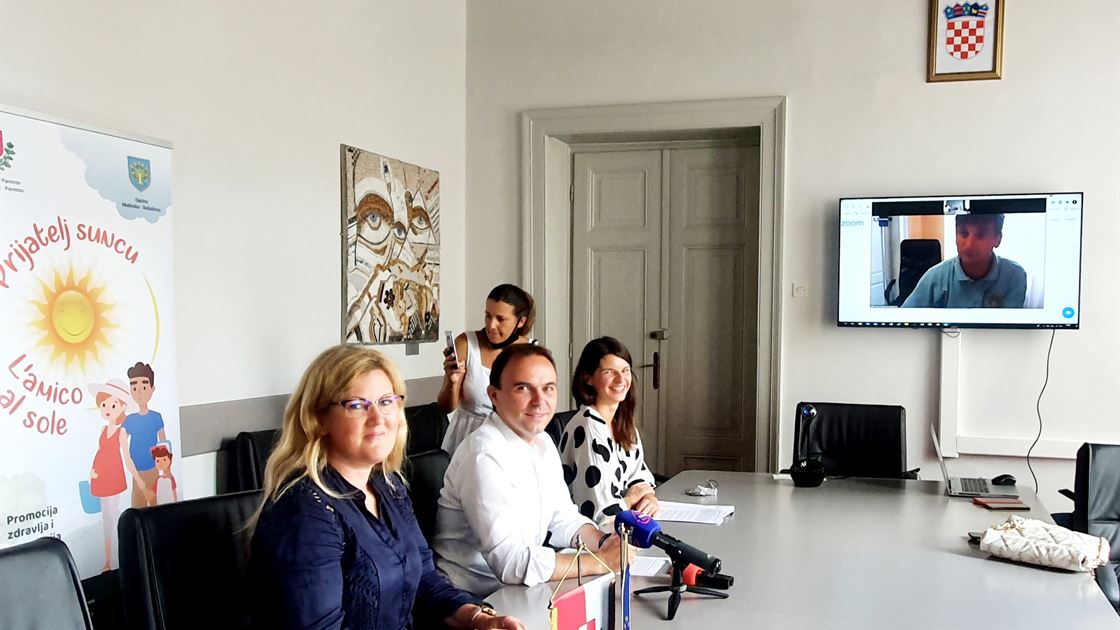 Poreč, 27.07.2021. Grad Poreč dobio je nedavno zeleno svjetlo Ministarstva zdravstva za financiranje provedbe projekta „Prijatelj Suncu“, koji će provoditi zajedno s partnerom Općinom Malinska-Dubašnica, s ciljem povećanja znanja i svijesti o važnosti promocije zdravlja i prevencije bolesti na području Poreča i Malinske. Projekt su danas u Maloj vijećnici predstavili porečki gradonačelnik Loris Peršurić, pročelnica Upravnog odjela za opću u pravu i gospodarstvo te viša stručna suradnica za gospodarstvo i razvojne projekte Dunja Babić, kao i partneri iz Općine Malinska-Dubašnica – putem Zoom-a načelnik Općine Robert Anton Kraljić.