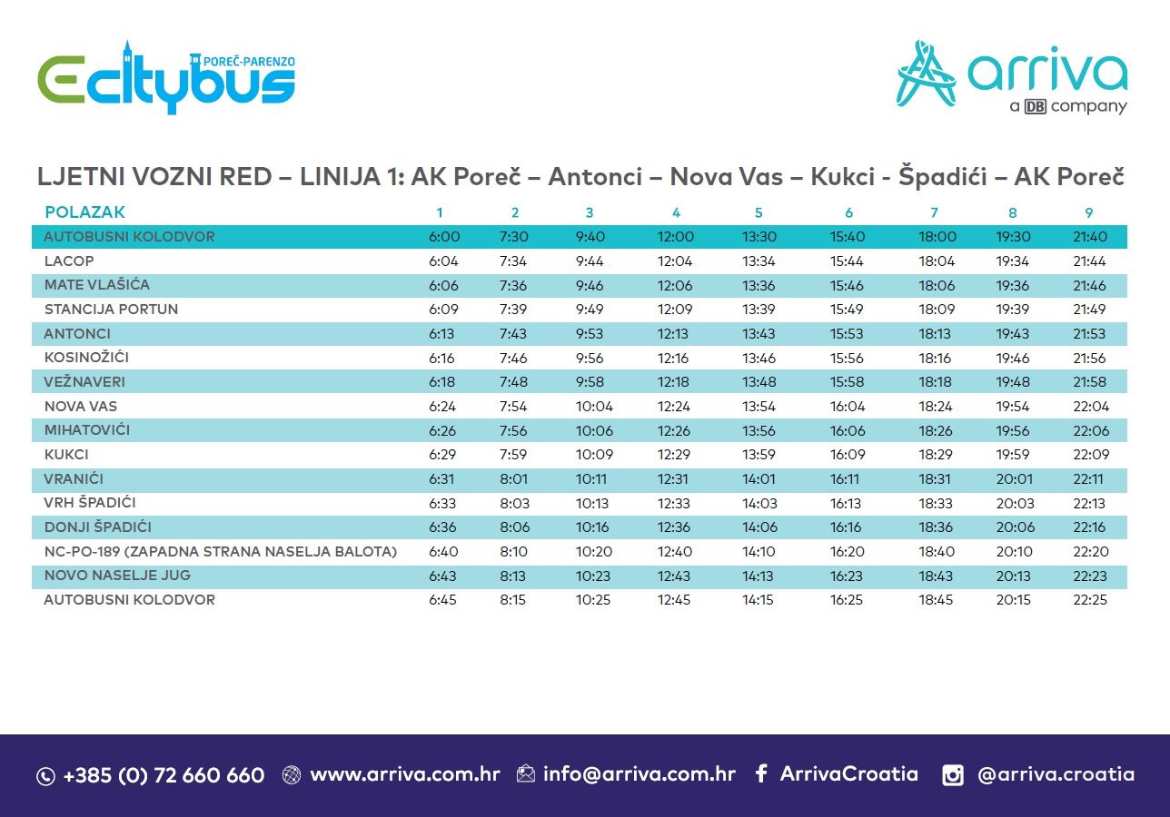 LINEA1: Stazione degli autobus Parenzo – Lacop, Mate Vlašić - Stanza Porton – Antonzi – Kosinožići – Vesnaveri- Villanova – Mihatovići - Kukci - Vranići – Rato de Spada – Spada – strada NC-PO180 (la parte ovest dell’abitato Mate Balota – Novo naselje sud – Stazione degli autobus Parenzo e