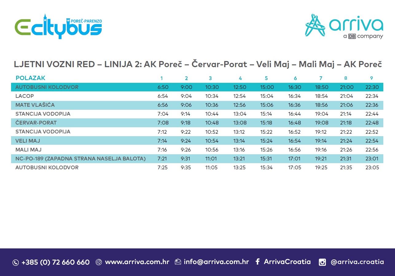 LINEA 2 - Stazione degli autobus Parenzo – Lacop- Mate Vlašić – Stanzia Bevilacqua est- Porto cervera—Stanzia Bevilacqua ovest- Maio Grando- Maio Picio- NC-PO180 (la parte ovest dell’abitato Mate Balota – Stazione degli autobus Parenzo.