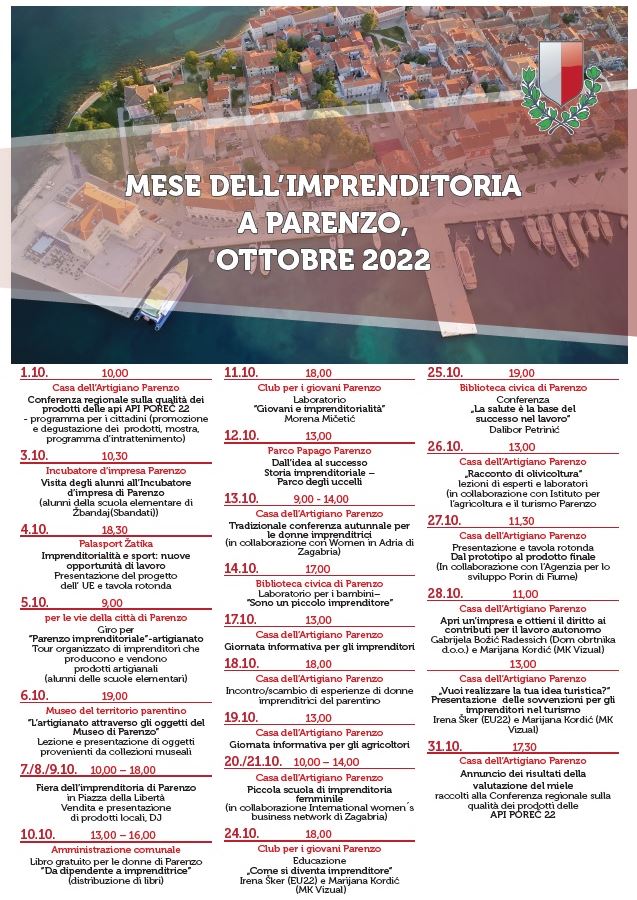 L’assessora ha sottolineato che per tutto il mese si svolgeranno attività all'insegna dello spirito imprenditoriale, rivolte ai giovani, ai bambini, agli imprenditori e a tutti coloro che pensano all'imprenditorialità. L'evento inizia venerdì con l'apertura del primo Convegno regionale sulla qualità dei prodotti delle api - API POREČ 22, durante il quale si terrà la promozione e la degustazione dei prodotti, una mostra e un programma di intrattenimento nella Casa dell’Artigiano.