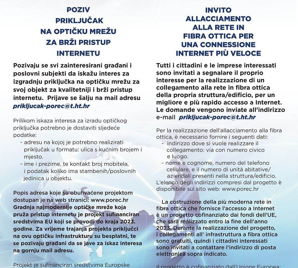Tutti i cittadini e le imprese interessati sono invitati a segnalare il proprio interesse per la realizzazione di un collegamento alla rete in fibra ottica della propria struttura/edificio, per un migliore e più rapido accesso a Internet. Le domande vengono inviate all'indirizzo e-mail: prikljucak-porec@t.ht.hr