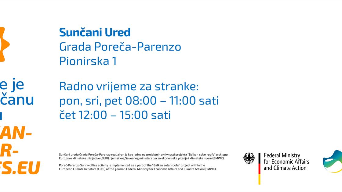 Sunčani ured nalazi se na adresi Pionirska 1, drugi kat. Radno vrijeme ureda za stranke je ponedjeljkom, srijedom i petkom od 08:00 do 11:00 sati, te utorkom od 12:00 do 15:00 sati, uz prethodnu obaveznu rezervaciju termina dolaska u ured putem adrese elektroničke pošte: suncani.ured@porec.hr