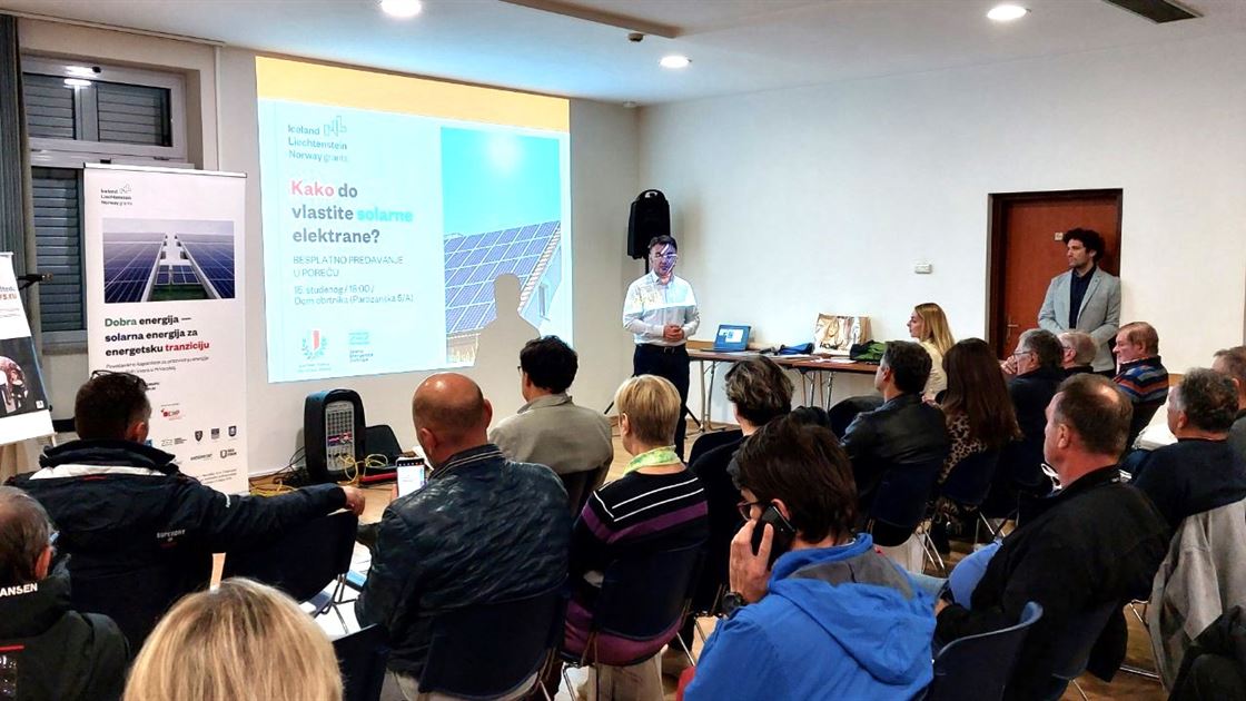 Veliki interes građana izazvalo je besplatno informativno predavanje koje su nedavno u Obrtničkom domu organizirali Grad Poreč-Parenzo i Sunčani ured Grada Poreča-Parenzo, u suradnji sa Zelenom energetskom zadrugom (ZEZ). Tema je bila ''Kako do vlastite solarne elektrane?'', a predavanje je bilo namijenjeno građanima i svima koji žele čuti ključne informacije o solarnim elektranama za kućanstva, uključujući informacije vezane uz troškove ugradnje, administrativne i tehničke korake do solarne elektrane na krovu, način obračuna struje iz solarne elektrane, ali i pitanja vezana uz solarne elektrane na višestambenim zgradama, te pitanja vezana uz, za građane povoljnije, izmjene zakonskog okvira vezanog za solarne elektrane koje su nastupile u 2023. godini.